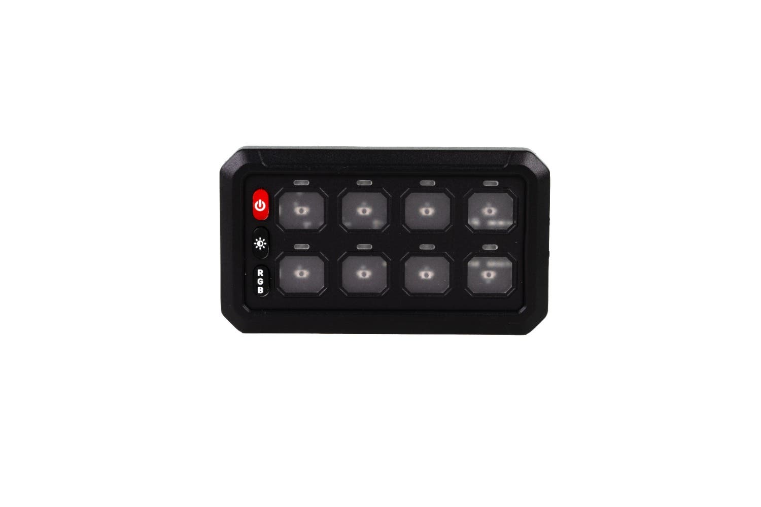 Brytarpanelen låter dig styra 8 olika LED-lampor eller enheter. Styr allt ditt fordonsutrustning med ett knapptryck. Du har 2 kontrollalternativ: Brytarpanel eller Bluetooth-app. Varje brytare har 3 olika ljuslägen. Röd: Växla, Blå: Momentan och Grön: pulserande blixtläge. Du kan ändra bakgrundsfärgen på knapparna samt ljusstyrkan. Bakgrundsbelysningen kan också automatiskt dimmas. Det medföljer många klistermärken att välja mellan för att indikera vad som är kopplat till vilken brytare. I appen finns det standardikoner eller så kan du ladda upp dina egna bilder. Max: 60a. Watt 720w@12v, 1440w@24v.