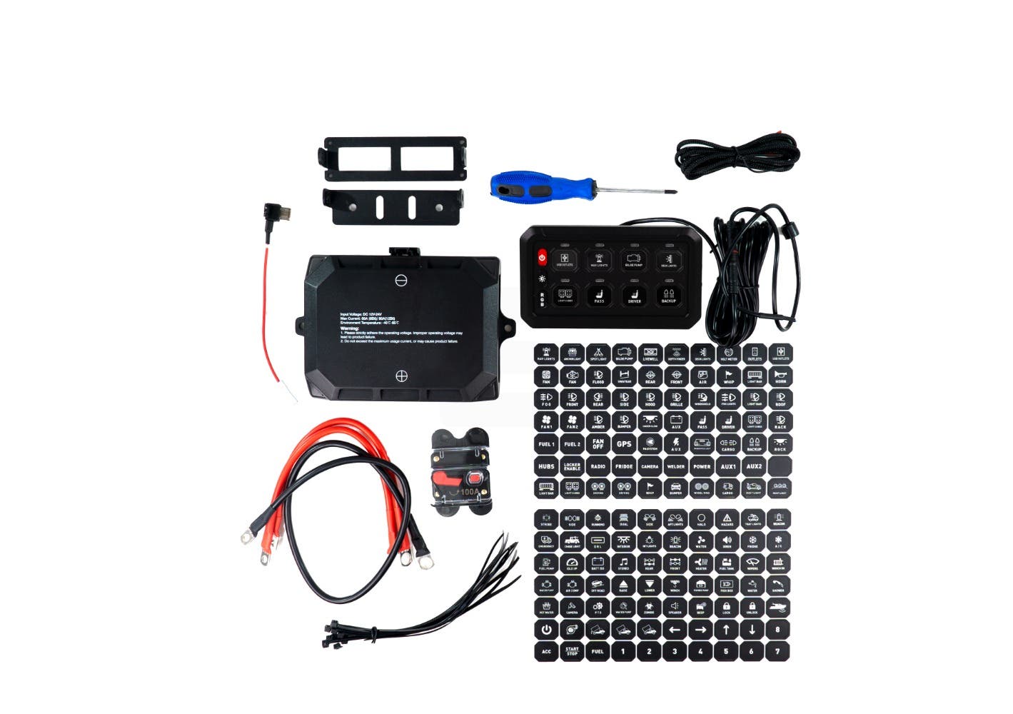 Med i paketet ingår 1 st strömbrytarpanel med strömfördelning, klistermärken, extra säkringar, kablar, buntband och skruvmejsel.