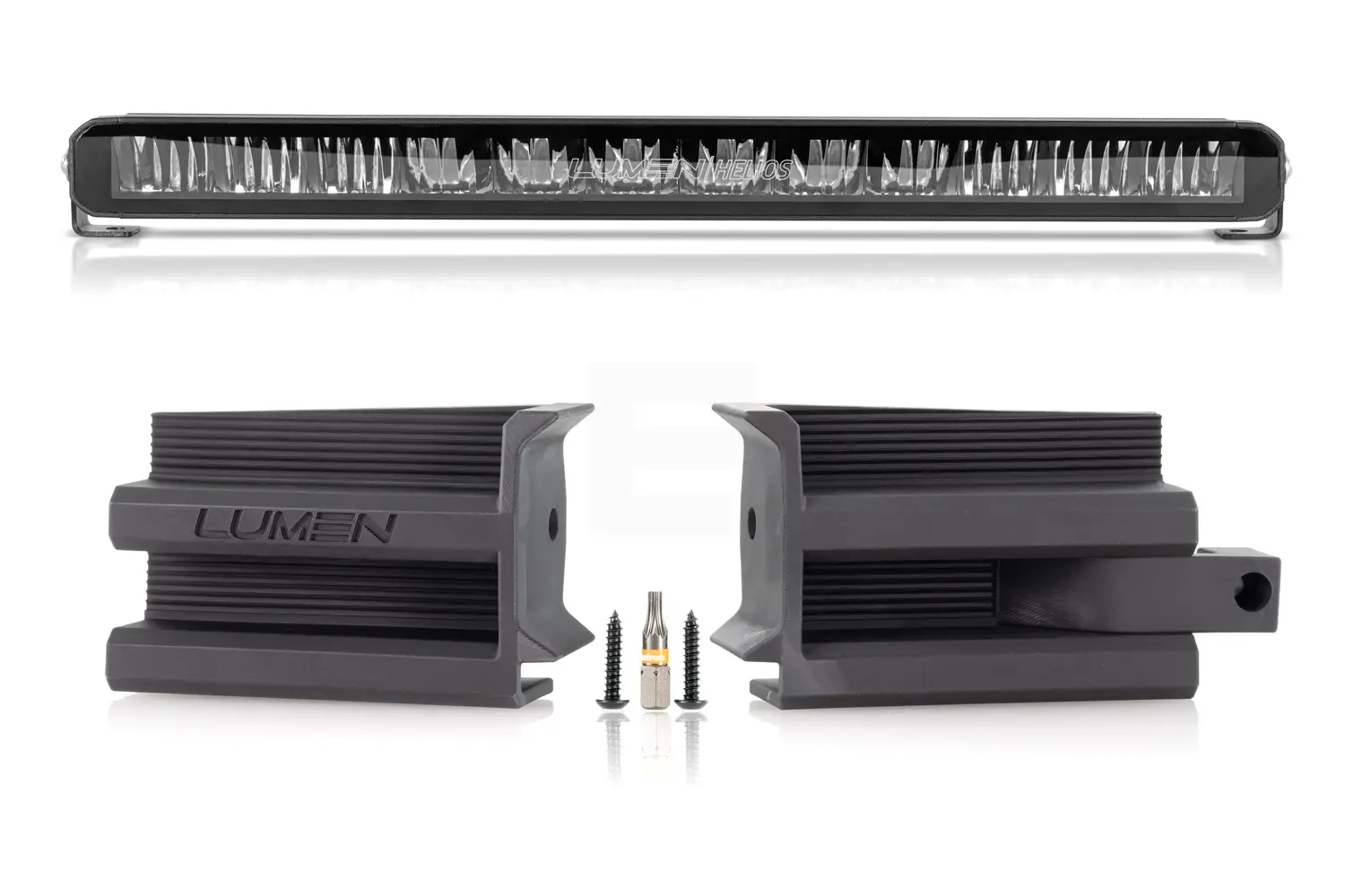 Detta ljuspaket levereras med en Lumen Performance LED-ramp som producerar imponerande 22 894 lumen! Lampan har snygga, mörka reflektorer som passar sömlöst in i grillen. LED-rampen har en ramlös design som gör det enkelt att hålla den ren och snöfri. Ljusbilden är exceptionell, med både längd och bredd, så att du får optimal belysning som lyser upp hela vägen. Här får du allt du behöver för en komplett lösning. LED-rampen ger dig ljus över hela vägen, både långt fram och åt sidorna. Vi lämnar 5 års garanti, fästena är designade och tillverkade i Lindesnes, Norge.